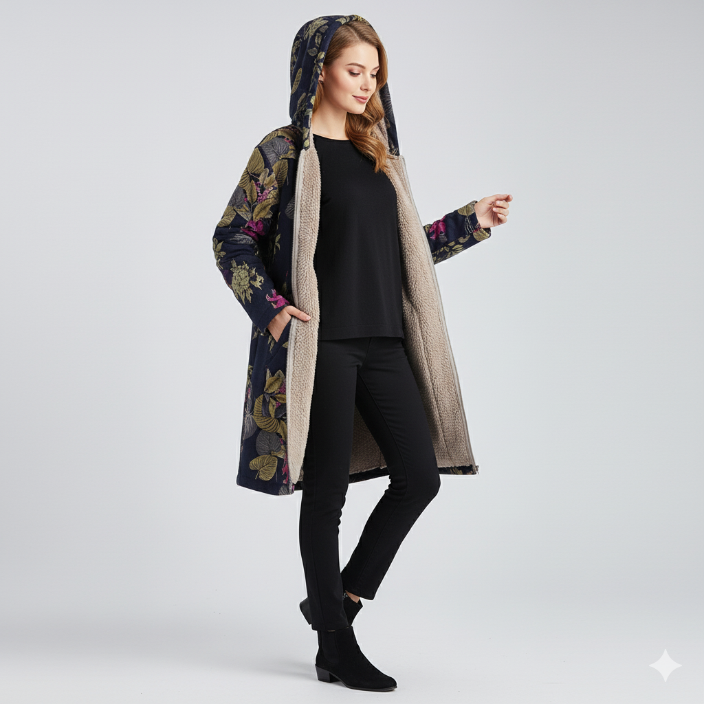 סנאע | מעיל חורף עם כובע לנשים — חום רך וסגנון פרחוני