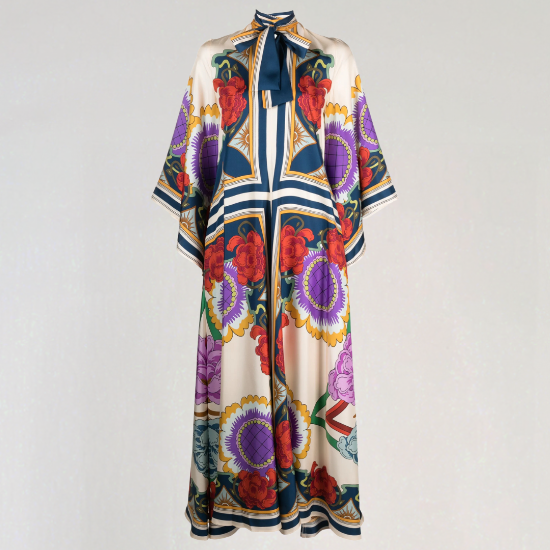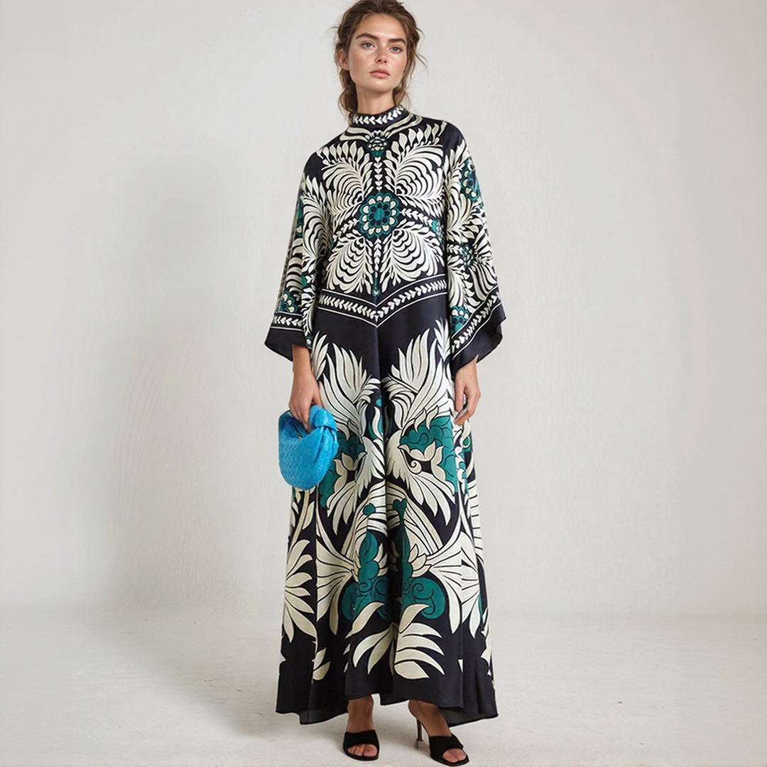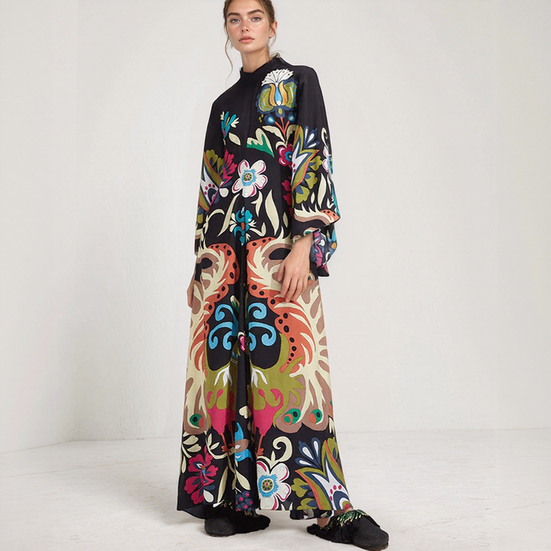 קטיה | שמלת מקסי בוהמית – צווארון הולטר ודפוס פרחוני אלגנטי