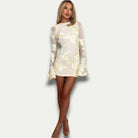 השמלה האמצעית מפתה עם הרקמה הפרחונית העדינה שלה ועם שרווליה הארוכים והקצת שקופים. הגב החשוף שלה מוסיף נגיעה של סנסואליות דיסקרטית, מושלמת לאירועים מיוחדים. זמינה בכמה צבעים, היא מתאימה לכל הרצונות שלכם עם אלגנטיות.