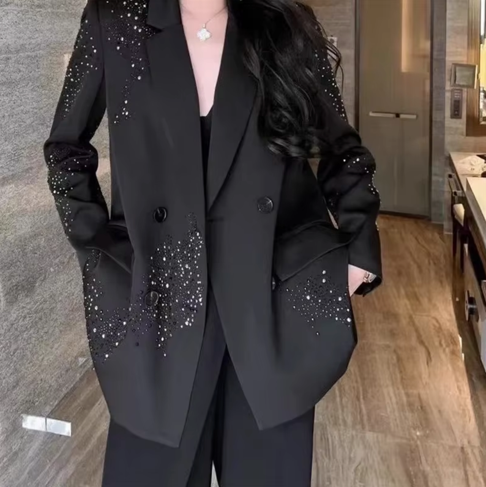 Questa giacca nera incarna l'eleganza moderna con un tocco di brillantezza delicata. I suoi dettagli scintillanti aggiungono una nota raffinata al tuo look, senza mai esagerare. Perfetta per una serata chic o un look professionale distinto, unisce sobrietà e splendore.