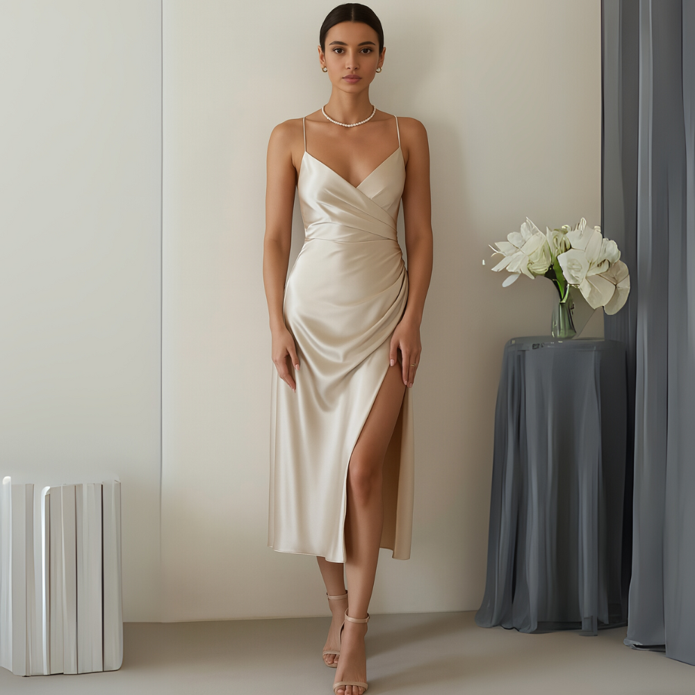 タリア | ミディドレス – 流れるようなエレガンスと光沢のある生地
