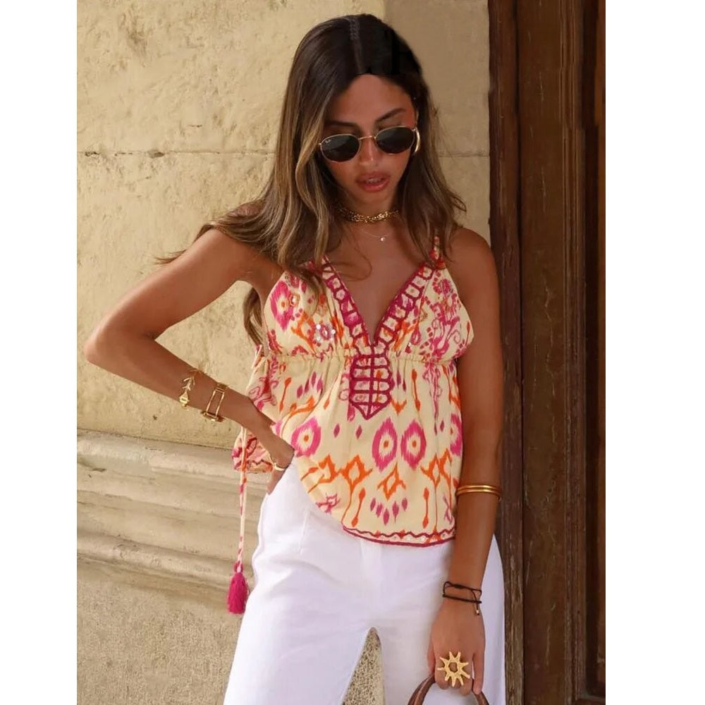Louna | Chic Uten Ermer Bluse – Avslappet Eleganse Og Solfylte Farger