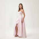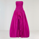 Dieses ausgestellte Maxikleid verführt mit seinem geraden Ausschnitt und dem gerafften Oberteil, das die Silhouette betont. Der voluminöse Saum verleiht bei jedem Schritt eine Note von Leichtigkeit und Fülle. Ideal für elegante Anlässe und festliche Abende.