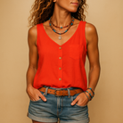 Această bluză fără mâneci cu decolteu în V oferă o croială lejeră și confortabilă. Disponibilă în mai multe culori, se potrivește cu toate ținutele tale. Ideală pentru zilele călduroase, îmbină stilul cu comoditatea.